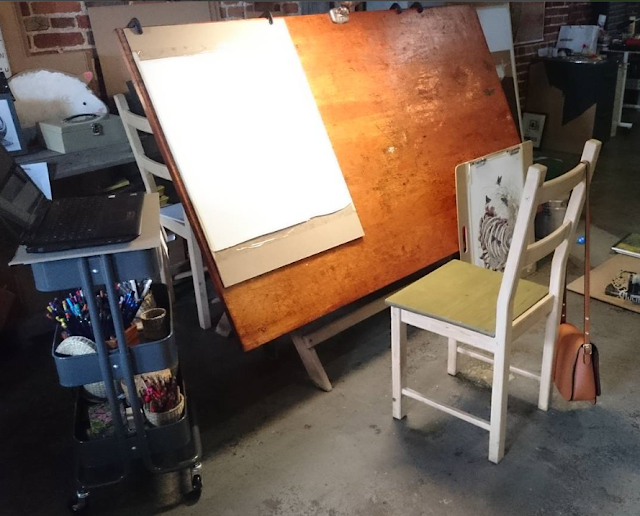 My work space is my loft in downtown St. Louis. My kitchen table is a vintage drafting table that doubles as my drawing surface. I have a cute little cart, that carries all of my supplies, that I drag around my apartment. I usually have my three cats climbing all over me and running like maniacs while I work. My apartment has been designed to fully function as my studio without looking like it.
