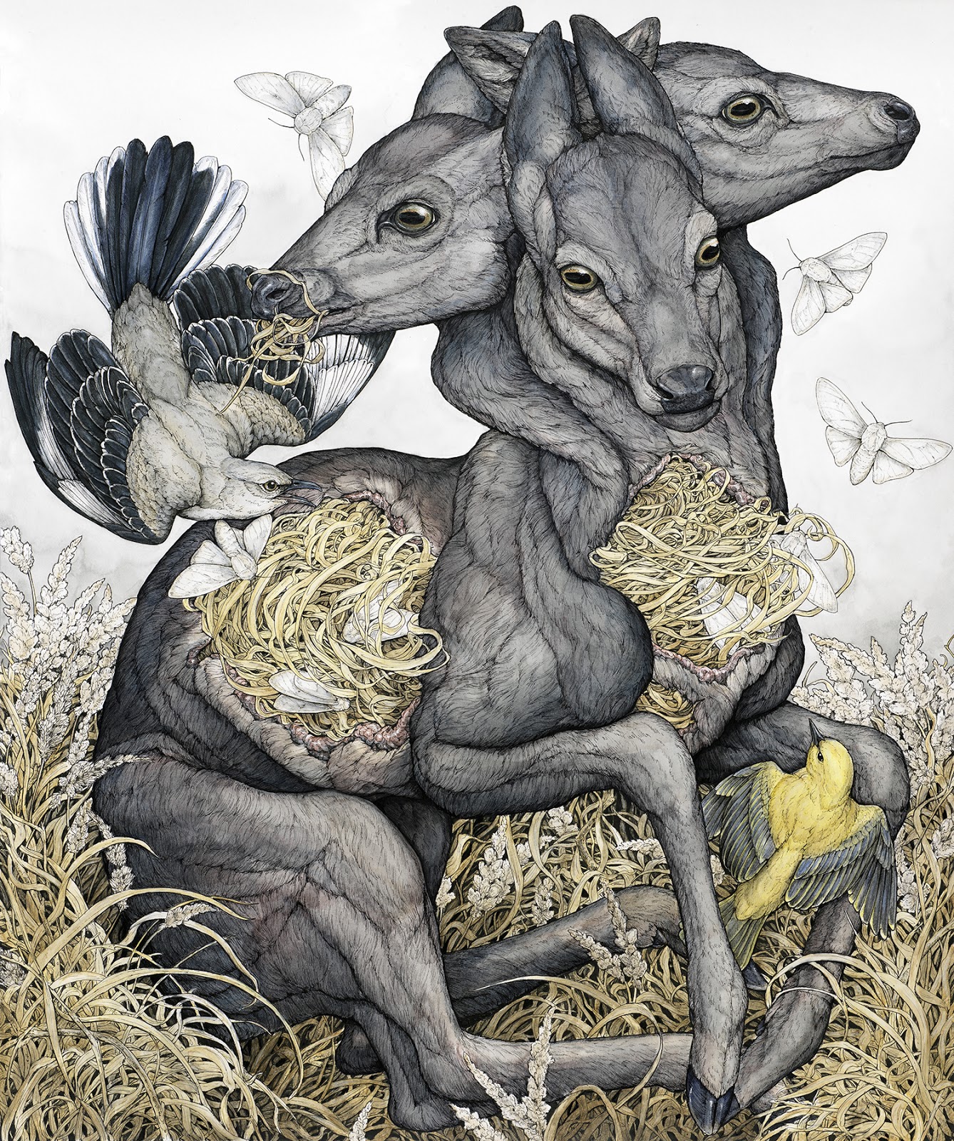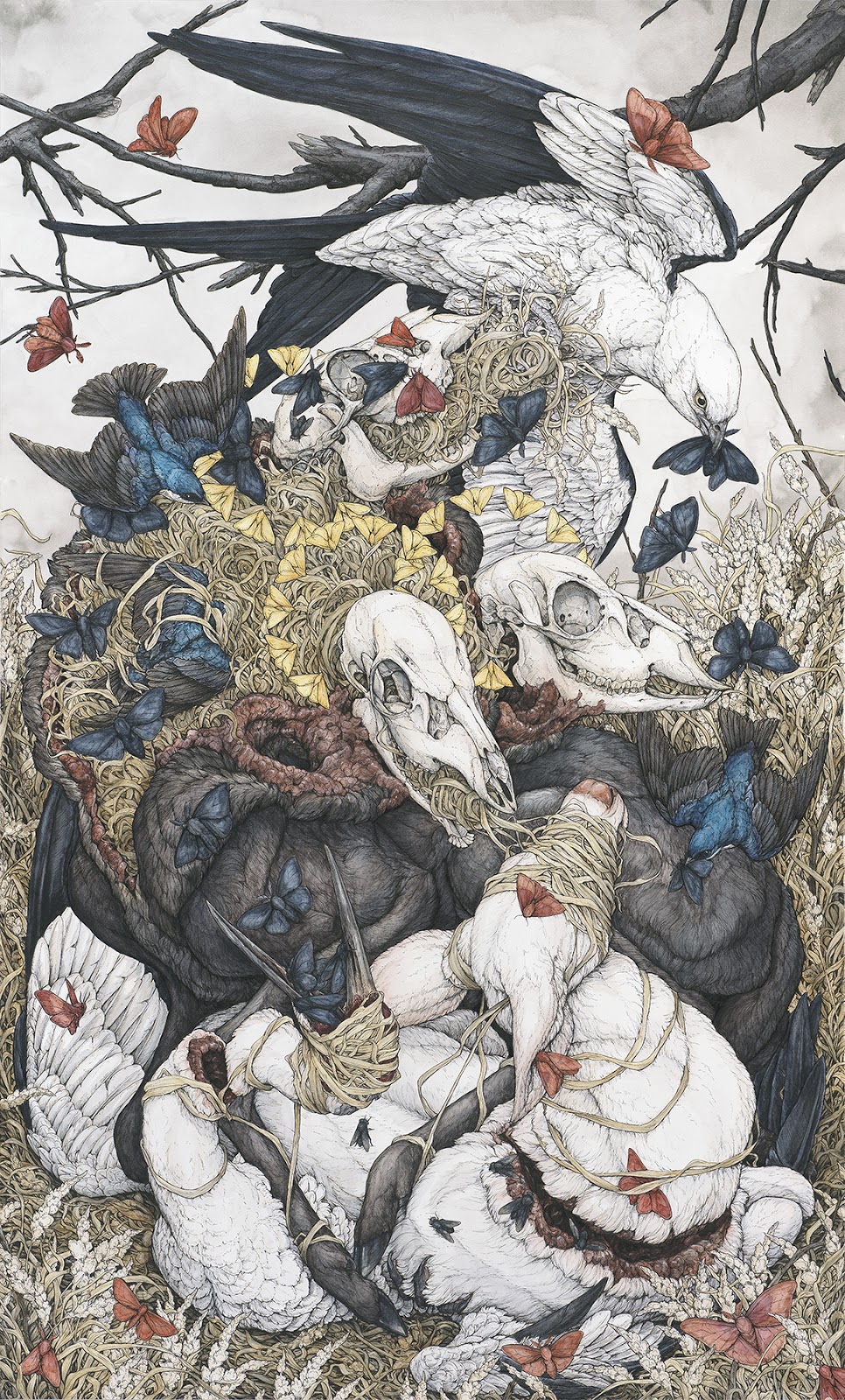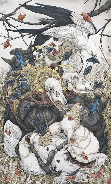 I use lots of things for inspiration! I collect animal skulls, feathers, taxiermies, shells, eggs, and various rocks, that can end up in pieces. I also find inspiration from my various art books and scientific illustrations. When it comes to generating ideas, they just kind of come to me. If I try to actively think of artwork ideas, nothing will come to me and I end up feeling very stressed. My ideas usually slam into my mind and become obsessive images until I can get them out in one way or another. I do keep a sketchbook, but I mainly write my ideas down which are usually accompanied by a very crude sketch. Right now, I am creating a sketchbook that will include more fleshed out ideas from my previous book. I'm having to get used to sketching since I started wanting to make larger works.